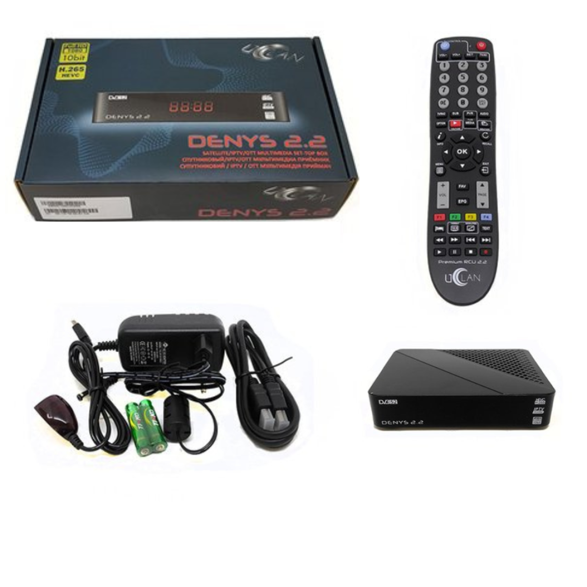 Супутниковий HD ресивер uClan (U2C) Denys 2.2. Характеристики uClan Denys 2.2: Операційна система Denys OS Новий високопродуктивний процесор GX6613H2 Доступ через веб-інтерфейс (WebIF) та FTP Висока швидкість та підвищена стабільність роботи IPTV Підтримка Stalker порталів Youtube, WebTV, онлайн кінотеатри, інтернет радіо Запис та Таймшифт LAN вхід 100 Мбіт/с Підтримка USB Wi-Fi та 3G/4G модемів Підтримка DLNA Підтримка Unicable та FastScan Підтримка DiSEqC 1.0, 1.1, 1.2 та USALS Підтримка EPG Просто зручний інтерфейс користувача 4 програмовані кнопки на пульті ДУ Підтримка Субтитрів та Телетексту Споживання 0.5W у режимі очікування Інтерфейси Денис 2.2: На лицьовій панелі: 4-розрядний 7-сегментний дисплей LED індикатор живлення (зелений вкл/червоний вимк) ІЧ-приймач На задній панелі: Вхід для супутникової антени Ethernet (LAN-вхід) HDMI вихід Цифровий аудіо-вихід SPDIF Minijack 3.5mm на RCA (аналоговий аудіо-відео вихід) Роз“єм для підключення зовнішнього ІЧ-приймача (є в комплекті) Роз“єм живлення 12В (блок живлення в комплекті) Сервісний роз“єм RS-232 На бічній панелі знаходяться два USB-входи версії 2.0 Комплектація Denys 2.2: Тюнер Denys 2 Пульт uClan Denys Premium Блок живлення 12В Інструкція користувача Зовнішній ІЧ-приймач HDMI кабель 1м Батарейки AAA, 2шт